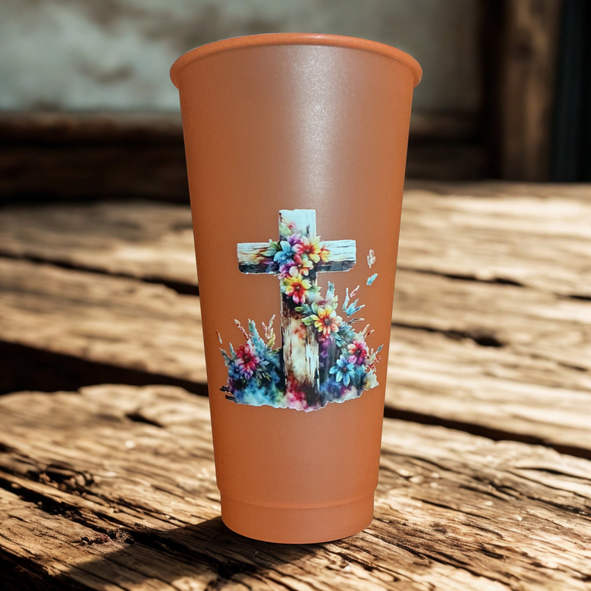 Este vaso personalizado cambia de color al contacto con líquidos, ofreciendo una experiencia visual única. Incluye tapa y sorbeto en colores aleatorios, ambos decorados con un motivo inspiracional de cruz, que aporta un toque significativo y elegante. Ideal para quienes buscan combinar funcionalidad con un diseño con mensaje, este vaso es perfecto para uso diario o como regalo especial.